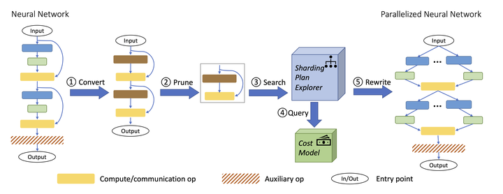 Overview of TAP. TAP takes a neural network as input and outputs the best tensor parallel schedule.Model parallelism is essential to train large language models efficiently. However, determining the optimal model parallel schedule for a given neural network can be slow and inefficient due to the vast choice space. To address this challenge, we propose a tensor model parallelism framework called TAP, which automatically searches for the best data and tensor parallel schedules. Our approach is based on the observation that a neural network can be represented as a directed acyclic graph, within which only exists a limited set of frequent subgraphs. With that, we design a graph pruning algorithm that efficiently folds the search space. As a result, TAP runs at sub-linear complexity with respect to model size, which makes it a practical solution for large-scale networks. Experimental results demonstrate that TAP outperforms the state-of-the-art automatic parallelism frameworks by 20-160x in searching time. Moreover, the performance of TAP’s discovered schedules is competitive with expert-engineered ones. In summary, TAP provides a powerful and efficient tool for model parallelism that can help alleviate the burden of manual tuning.