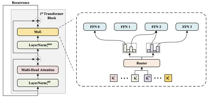 Overall architecture of WideNet.More transformer blocks with residual connections have recently achieved impressive results on various tasks. To achieve better performance with fewer trainable parameters, recent methods are proposed to go shallower by parameter sharing or model compressing along with the depth. However, weak modeling capacity limits their performance. Contrastively, going wider by inducing more trainable matrixes and parameters would produce a huge model requiring advanced parallelism to train and inference. In this paper, we propose a parameter-efficient framework, going wider instead of deeper. Specially, following existing works, we adapt parameter sharing to compress along depth. But, such deployment would limit the performance. To maximize modeling capacity, we scale along model width by replacing feed-forward network (FFN) with mixture-of-experts (MoE). Across transformer blocks, instead of sharing normalization layers, we propose to use individual layernorms to transform various semantic representations in a more parameter-efficient way. To evaluate our plug-and-run framework, we design WideNet and conduct comprehensive experiments on popular computer vision and natural language processing benchmarks. On ImageNet-1K, our best model outperforms Vision Transformer (ViT) by 1.5% with 0.72× trainable parameters. Using 0.46× and 0.13× parameters, our WideNet can still surpass ViT and ViT-MoE by 0.8% and 2.1%, respectively. On four natural language processing datasets, WideNet outperforms ALBERT by 1.8% on average and surpass BERT using factorized embedding parameterization by 0.8% with fewer parameters.